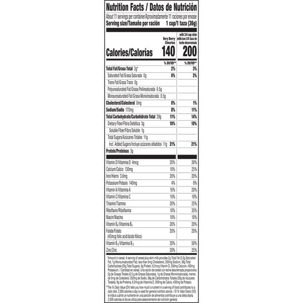 • DELICIOUS FRUITY CEREAL: Sweetened whole grain oat cereal with the taste of strawberries, raspberries, and blueberries; Flavored with real fruit and other natural flavors