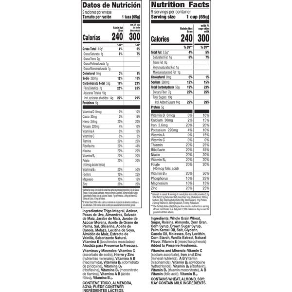 Whole Grain Wheat, Sugar, Raisins, Almonds, Corn Bran, Corn Syrup, Brown Sugar Syrup, Palm Kernel Oil, Salt, Glycerin, Canola Oil, Molasses, Soy Lecithin, Corn Starch, Vanilla Extract, Natural Flavor, Vitamin E (mixed Tocopherols) Added To Preserve Freshness, Vitamins And Minerals: Vitamin C (sodium Ascorbate), Iron And Zinc (mineral Nutrients), A B Vitamin (niacinamide), Vitamin B₆ (pyridoxine Hydrochloride), Vitamin B₂ (riboflavin), Vitamin B₁ (thiamin Mononitrate), A B Vitamin (folic Acid), Vitamin B₁₂