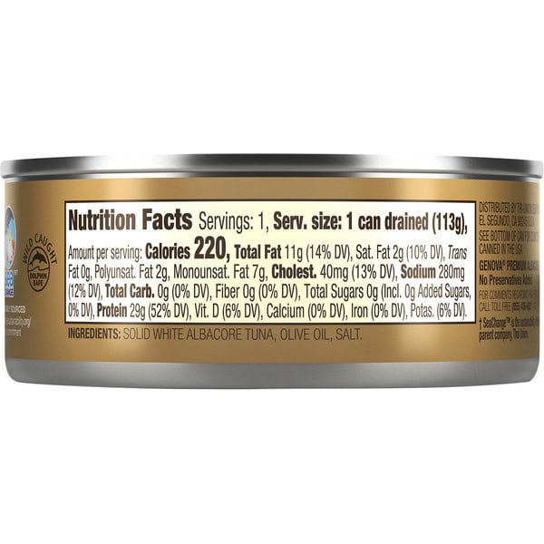 Genova premium albacore tuna is wild caught, hand-selected and packed in olive oil with a pinch of sea salt for a savory yet mild flavor and perfect texture. Packed with protein and heart-healthy omegas, it is perfect for Mediterranean, keto and paleo snacks and meals. It has no GMOs, 100% natural ingredients and no preservatives — just simple ingredients and rich taste. The incredible taste of Genova premium canned tuna is central to countless inspired dishes. Elevate your next salad, appetizer or entree with delicious Mediterranean flavor.