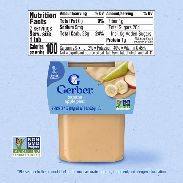 Gerber Stage 2 Baby Food, Banana Apple Pear Puree Tubs are a premium choice for your child’s early stages. Crafted to help support their nutritional needs, along with meeting the busy lifestyle needs of caretakers and parents. Each baby puree tub comes in a portable, easy-to-store format – making it perfect for life’s busy moments. This stage 2 baby food puree is designed for babies who are 6 months + and are ready to explore new textures and flavors. Gerber understands the importance of providing wholesome ingredients during the crucial developmental stages of your child’s life — that’s why our baby puree is Non-GMO Project Verified. Gerber baby puree is ideal for parents who seek a convenient and high-quality option in their baby’s diet. These tubs need to be refrigerated after opening and must be used after 1 day.