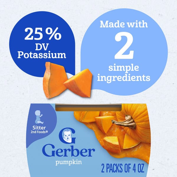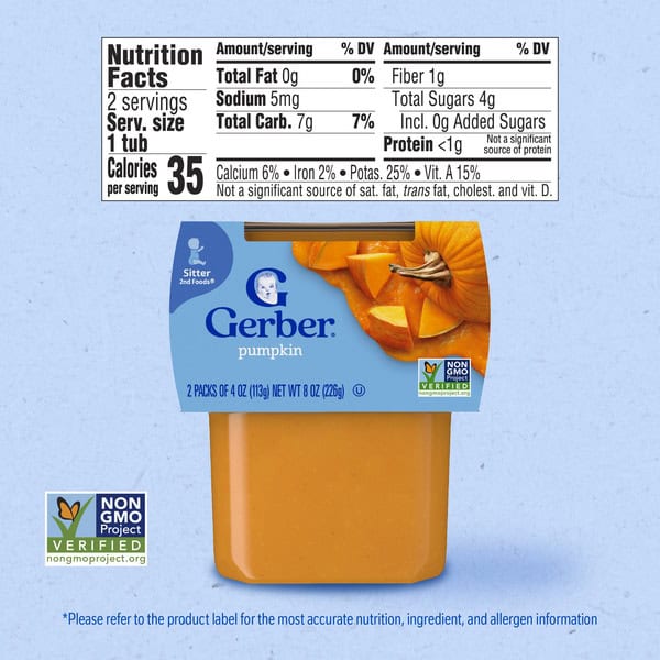 Gerber Stage 2 Baby Food, Pumpkin Puree Tubs are a premium choice for your child’s early stages. Crafted to help support their nutritional needs, along with meeting the busy lifestyle needs of caretakers and parents. Each baby puree tub comes in a portable, easy-to-store format – making it perfect for life’s busy moments. This stage 2 baby food puree is designed for babies who are 6 months + and are ready to explore new textures and flavors. Gerber understands the importance of providing wholesome ingredients during the crucial developmental stages of your child’s life — that’s why our baby puree is Non-GMO Project Verified. Gerber baby puree is ideal for parents who seek a convenient and high-quality option in their baby’s diet. These tubs need to be refrigerated after opening and must be used after 1 day.