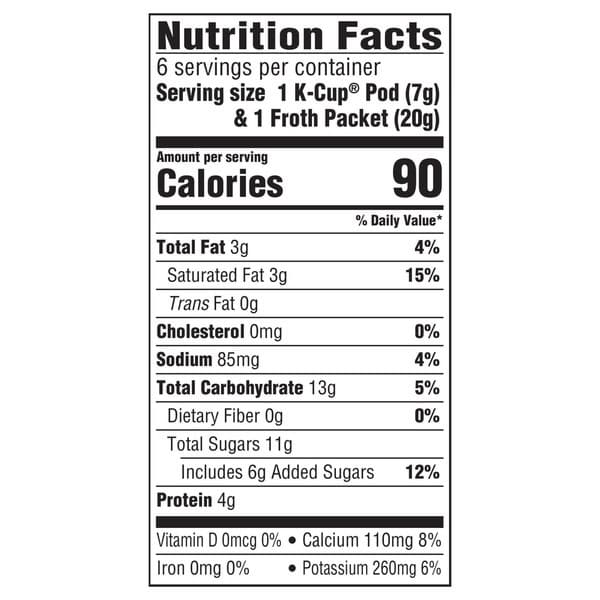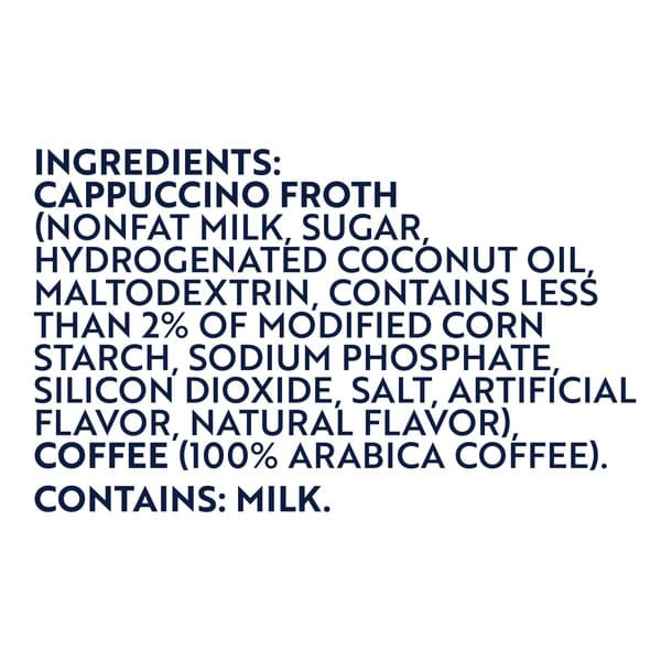 Cappuccino Froth (nonfat Milk, Sugar, Hydrogenated Coconut Oil, Maltodextrin, Contains Less Than 2% Of Modified Corn Starch, Sodium Phosphate, Silicon Dioxide, Salt, Artificial Flavor, Natural Flavor), Coffee (100% Arabica Coffee).