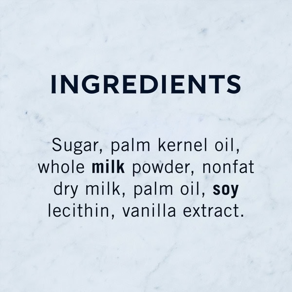 Sugar, Palm Kernel Oil, Whole Milk Powder, Nonfat Dry Milk, Palm Oil, Soy Lecithin, Vanilla Extract