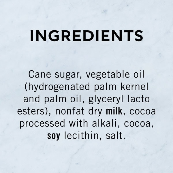 Cane Sugar, Vegetable Oil (hydrogenated Palm Kernel And Palm Oil, Glyceryl Lacto Esters), Nonfat Dry Milk, Cocoa Processed With Alkali, Cocoa, Soy Lecithin, Salt