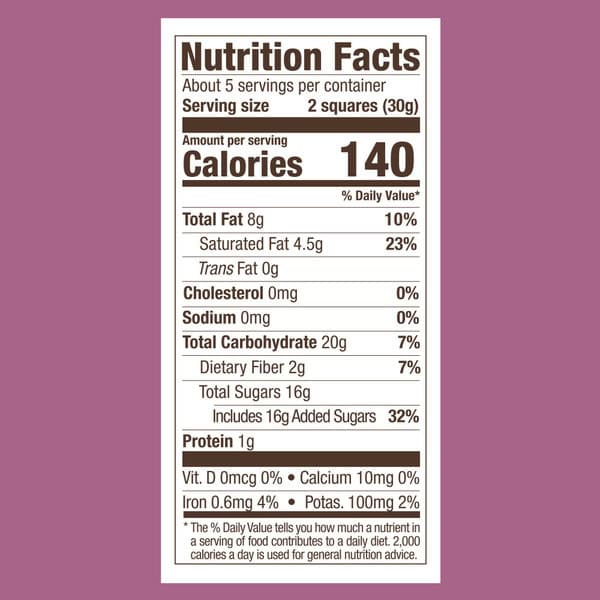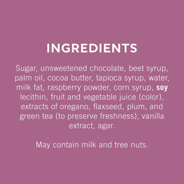 Sugar, Unsweetened Chocolate, Beet Syrup, Palm Oil, Cocoa Butter, Tapioca Syrup, Water, Milk Fat, Raspberry Powder, Corn Syrup, Soy Lecithin, Fruit And Vegetable Juice (color), Extracts Of Oregano, Flaxseed, Plum, And Green Tea (to Preserve Freshness), Vanilla Extract, Agar