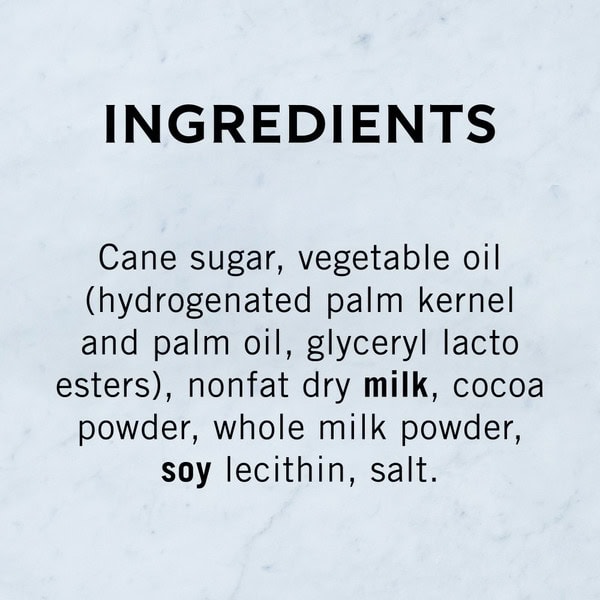 Cane Sugar, Vegetable Oil (hydrogenated Palm Kernal And Palm Oil, Glyceryl Lacto Esters), Nonfat Dry Milk, Cocoa Powder, Whole Milk Powder, Soy Lecithin, Salt