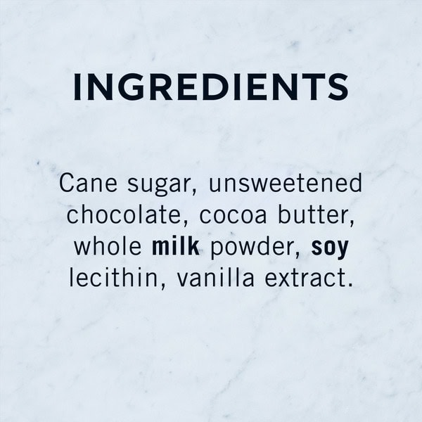 Cane Sugar, Unsweetened Chocolate, Cocoa Butter, Whole Milk Powder, Soy Lecithin, Vanilla Extract