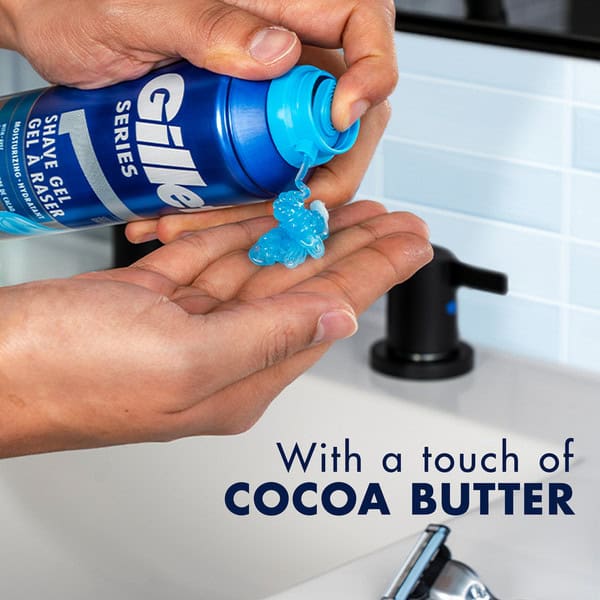 Experience the hydrating power of Gillette Series Moisturizing Shave Gel with Cocoa Butter. It provides complete defense against shaving irritation, helping reduce cuts, redness, burning, stinging and tightness. This shaving cream transforms into a thick lather that helps restore the skin’s natural moisture barrier by locking hydration in, helping reduce skin irritation. You’ll also get an even smoother shave: This men’s shaving gel contains extra moisturizers and lubricants (vs Gillette Classic Shave Foam) that hydrate each hair to shave it off with few tugs, pulls and friction. That means less time and energy spent on your grooming ritual and more comfort in your shave. Show the world your best face with the Gillette Series Moisturizing Shave Gel for men, made by the World’s Number One Shave Gel & Foam brand. Apply a thick, even amount of shaving gel over the area. Using shave gel properly will help prevent moisture loss and add an additional layer of protection to avoid any nicks, cuts and hair pulls while you shave, and thus cut down skin irritation post-shave. For great results, use with the Gillette Mach3 or your favorite Gillette razor.