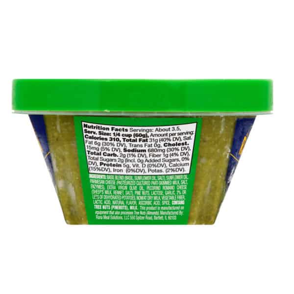 Basil Blend (basil, Sunflower Oil, Salt), Sunflower Oil, Parmesan Cheese (pasteurized Cultured Part-skimmed Milk, Salt, Enzymes), Extra Virgin Olive Oil, Pecorino Romano Cheese (sheep’s Milk, Rennet, Salt), Pine Nuts, Lactose, Garlic, 2% Or Less Of Dehydrated Potatoes, Nonfat Dry Milk, Vegetable Fiber, Lactic Acid, Natural Flavor, Ascorbic Acid, Spice