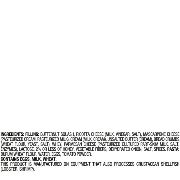 Filling (butternut Squash, Ricotta (whey, Whole Milk, Cream, Vinegar), Parmesan Cheese (pasteurized Cultured Milk, Salt, Enzymes), Bread Crumbs (wheat Flour, Yeast, Salt), Heavy Cream (cream, Apple Mostarda (quince, Sugar, Mustard Flavor), Unsalted Butter (cream), Chicory Root Fiber, Potato Starch, Vegetable Fiber, 2% Or Less Of Amarett) Cookies (sugar, Apricot Kernels, Egg Whites, Lactose And Milk Proteins, Leavening (sodium Hydrogen Carbonate), Natural Flavor), Dehydrated Potatoes, Salt, Natural Flavors), Pasta (durum Wheat Flour, Eggs, Water, Dried Tomato)