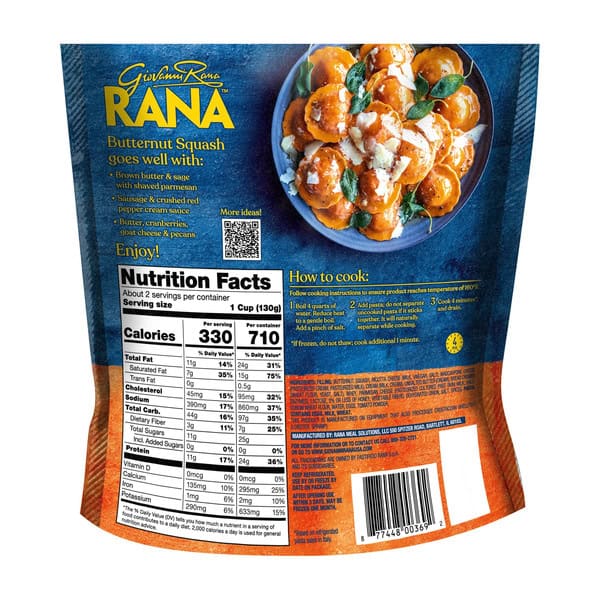 Giovanni Rana’s Butternut Squash Ravioli is made with sweet and creamy butternut squash wrapped in thin pasta. Using high quality ingredients and no preservatives, no powdered eggs, no gums, no hydrogenated fats, and no artificial flavors or colors Giovanni Rana’s pasta makes a wonderful choice for meals. Preparing our ravioli in three easy steps: