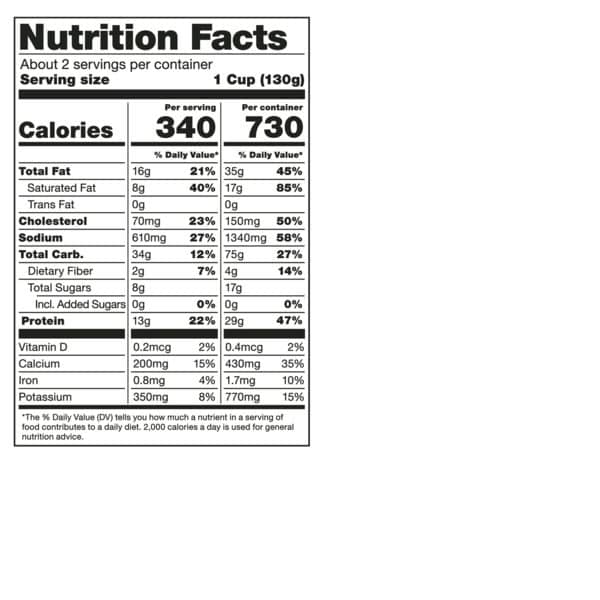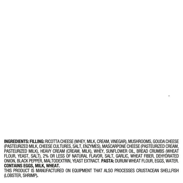 Filling (mushrooms, Ricotta (whey, Milk, Cream, Vinegar), Bread Crumbs (wheat Flour, Yeast, Salt), Mozzarella Cheese (pasteurized Cultured Milk, Salt, Enzymes), Sunflower Oil, Whey, Chicory Root Fiber, Parmesan Cheese (pasteurized Cultured Part-skimmed Milk, Salt, Enzymes), Corn Starch And Potato Fiber, Potato Starch, Natural Flavors, 2% Or Less Of Salt, Onions, Autolyzed Yeast Extract, Dehydrated Onion, Nonfat Dry Milk, Spice), Pasta (durum Wheat Flour, Eggs, Water)