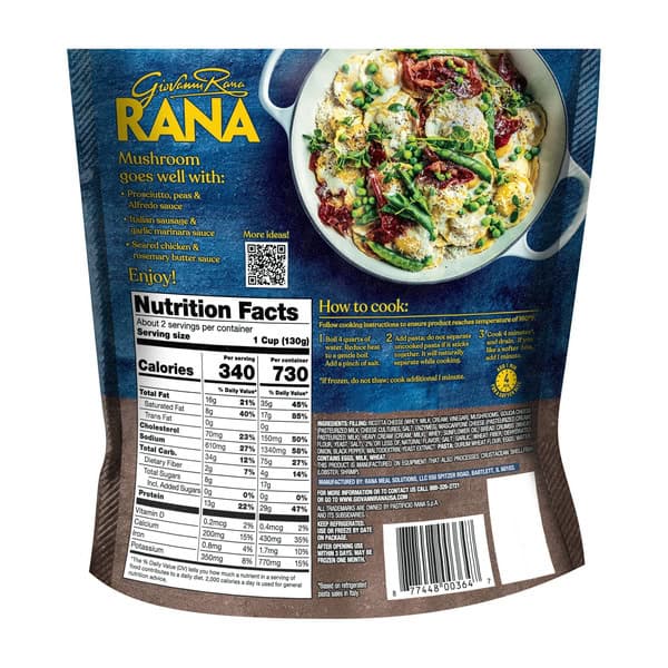 Serving Suggestions: Pair with Giovanni Rana Alfredo Sauce or try Mushroom Ravioli with Shrimp & Vegetables. Saute shrimp and previously blanched vegetables in olive oil. Add prepared ravioli and some cooking water. Top with hand-torn fresh mozzarella.
