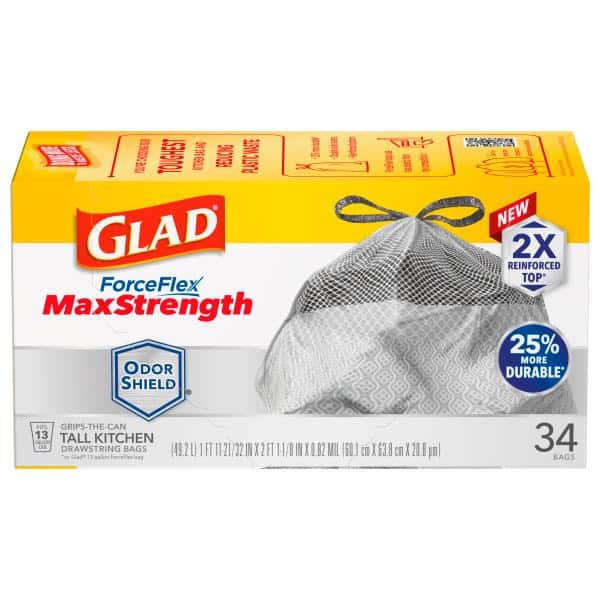 • 25% MORE DURABLE*: Glad® ForceFlex MaxStrength Tall Kitchen Trash Bags are 25% more durable versus Glad® 13 gallon ForceFlex tall kitchen bags; packaging may vary