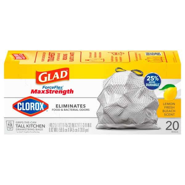 Glad® and Clorox have joined forces to create a trash bag with the strength of Glad® and the scent of Clorox™ Lemon Fresh Bleach scent. Glad® ForceFlex MaxStrength with Clorox™ Tall Kitchen Trash Bags are 25% more durable* and help eliminate food and bacterial odors to help keep your kitchen smelling clean. These 13 gallon bags feature an outer leak protection layer and an inner layer that stretches to prevent rips and tears. These versatile garbage bags feature the clean smell of Lemon Fresh Bleach. The drawstring grips the trash can, keeping the bag in place. These bags are made with 100% renewable electricity. And here’s something cool: if everyone in the U.S. chose Glad® drawstring trash bags it would save 100 million pounds of plastic from going into landfills every year**. *Compared to a standard 13-gallon Glad Kitchen bag. **Based on IRI sales data. Glad® Kitchen drawstring bags are made with 7% to 22% less plastic vs top 10 competitors.