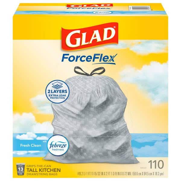 Let the stretchable strength of Glad ForceFlex handle all the messes our busy daily life can throw at it and then some. Glad Tall Kitchen Drawstring Trash Bags are designed with ForceFlex technology to give extra flex as it expands around sharp edges and heavy loads, so you can pack it in while resisting tears, rips and punctures. These trash bags are designed with two layers for extra leak protection. RipGuard and LeakGuard technology prevent seepage of liquids and keep trash contained. Fight nasty kitchen odors with the exclusive Glad trash bag combination of steady release of Febreze freshness and irresistible Fresh Clean scent that traps, locks and neutralizes odors. The durable Grips The Can Drawstring ensures a tight grip on the trash can to keep it in place. Take the trash to the curb with no fear of leaks and tears, and no frustration. FEBREZE is used under license from The Procter and Gamble Company or its affiliates.