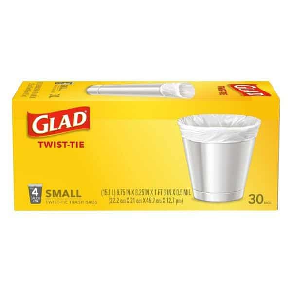 Glad Twist-Tie Small Trash Bags are the perfect size for handling daily household chores and everyday trash demands. These 4 gallon trash bags are strong and sturdy to keep trash contained and avoid messy trash disasters. The Glad trash bags secure with a simple twist tie for quick, easy closure. Each Glad 4-gallon trash bag measures 8.75 inches by 8.25 inches by 1 foot 6 inches, making it just the right size for small garbage cans around the home and office. Stock your kitchen, nursery, bedroom, office and break room with these handy garbage bags. They also make ideal small bathroom trash bags. Besides holding trash, these small garbage bags are perfect for tucking into a travel bag to keep dirty or wet clothing separate from other items. They’re also great for packing and storing sports equipment, toys and more. Take control of trash with Glad, and protect your home from garbage disasters. It’s better than all good. It’s all Glad.
