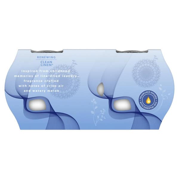 Enjoy the familiar feeling of clean comfort with Glade Clean Linen single wick candle. Freshen your space with our aroma scented candles infused with essential oils and crafted by master perfumers. Our expertly crafted candles enhance the atmosphere of any room with the scent of line-dried laundry and sunny citrus. This classic scent gets a modern twist with our small scented candle made without phthalates, parabens, or formaldehyde. Discover the power of fragrant candles in Clean Linen fragrance. Glade’s small jar candles are infused with Essential Oils and quickly fill your home with fragrance and warm light. Packaging may vary.
