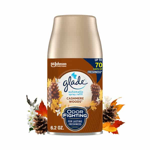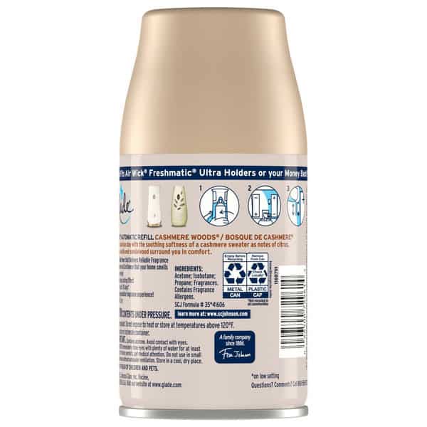 The perfect excuse to stay in and snuggle up with Glade Comforting Cashmere Woods Automatic Spray Refill. Get all up in those fuzzy feels with scent diffuser with notes of jasmine petals, creamy sandalwood, and musk. Glade air freshener fragrance is crafted by master perfumers. Switch things up with automatic air freshener dispenser in Comforting Cashmere Woods scent. Open the unit by squeezing the ribs on the side while pulling sides of holder apart. Insert Glade automatic spray refill and choose the time setting to release fragrance. This automatic air freshener spray gives a fresh burst every 9, 18 or 36 minutes. Surround yourself with room freshener fragrance infused with essential oils and create the coziness you’re craving.