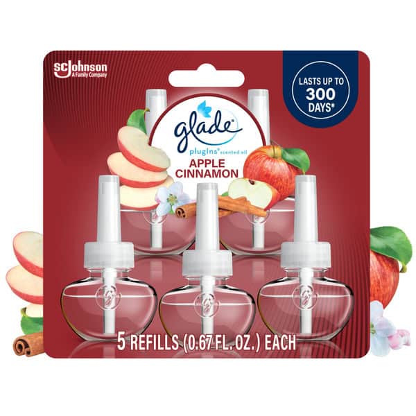 Get cozy with our Glade Apple Cinnamon PlugIns air freshener for home. Crafted by master perfumers with notes of McIntosh apple, cinnamon spice and sweet vanilla. Spice things up with our scent diffuser and change the mood with 2x more adjustability (vs. previous Glade warmer). Express your mood with electric oil diffuser in Apple Cinnamon fragrance. Simply remove the cap from the refill and insert it into the Glade plug in warmer. Plug the warmer into an outlet and adjust the level of fragrance to create the mood you want. Feel right at home with Glade’s PlugIn air freshener and fragrance infused with essential oils.