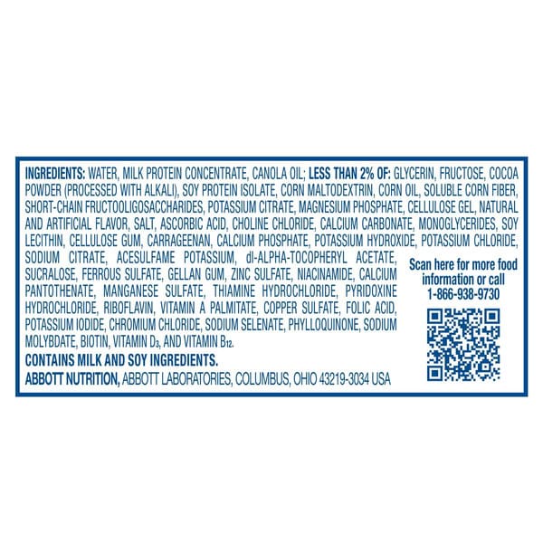 Water, Milk Protein Concentrate, Canola Oil, Less Than 2% Of: Glycerin, Fructose, Cocoa Powder (processed With Alkali), Soy Protein Isolate, Corn Maltodextrin, Corn Oil, Soluble Corn Fiber, Short-chain Fructooligosaccharides, Potassium Citrate, Magnesium Phosphate, Cellulose Gel, Natural And Artificial Flavor, Salt, Choline Chloride, Ascorbic Acid, Calcium Carbonate, Soy Lecithin, Monoglycerides, Cellulose Gum, Calcium Phosphate, Potassium Chloride, Carrageenan, Sodium Citrate, Turmeric Color, Acesulfame Potassium, Di-alpha-tocopheryl Acetate, Sucralose, Ferrous Sulfate, Gellan Gum, Zinc Sulfate, Niacinamide, Calcium Pantothenate, Red 3, Manganese Sulfate, Thiamine Hydrochloride, Pyridoxine Hydrochloride, Riboflavin, Vitamin A Palmitate, Copper Sulfate, Folic Acid, Potassium Iodide, Chromium Chloride, Sodium Selenate, Phylloquinone, Sodium Molybdate, Biotin, Vitamin D3, And Vitamin B12