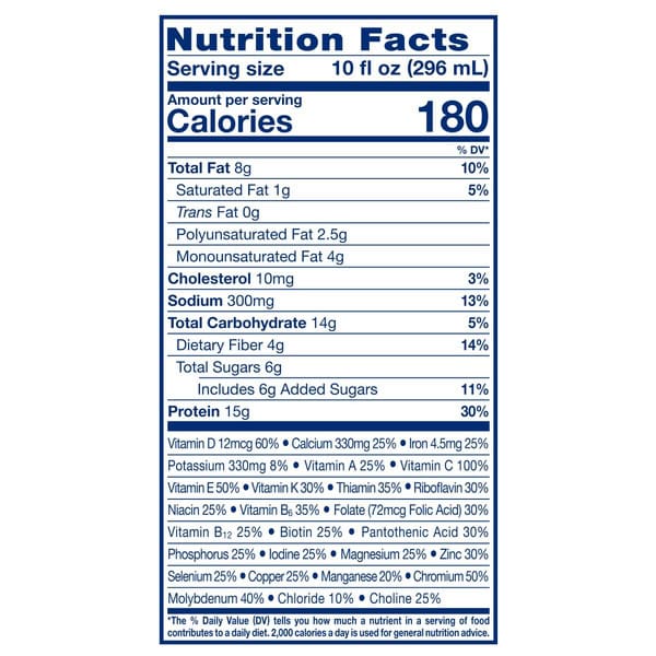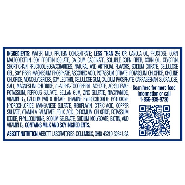 Water, Milk Protein Concentrate, Less Than 2% Of: Canola Oil, Fructose, Corn Maltodextrin, Soy Protein Isolate, Calcium Caseinate, Soluble Corn Fiber, Corn Oil, Glycerin, Short-chain Fructooligosaccharides, Natural And Artificial Flavors, Sodium Citrate, Cellulose Gel, Soy Fiber, Magnesium Phosphate, Ascorbic Acid, Potassium Citrate, Potassium Chloride, Choline Chloride, Monoglycerides, Soy Lecithin, Cellulose Gum, Calcium Phosphate, Carrageenan, Sucralose, Salt, Magnesium Chloride, Dl-alpha-tocopheryl Acetate, Acesulfame Potassium, Ferrous Sulfate, Gellan Gum, Zinc Sulfate, Niacinamide, Vitamin B₁₂, Calcium Pantothenate, Thiamine Hydrochloride, Pyridoxine Hydrochloride, Manganese Sulfate, Riboflavin, Citric Acid, Copper Sulfate, Vitamin A Palmitate, Folic Acid, Chromium Chloride, Potassium Iodide, Phylloquinone, Sodium Selenate, Sodium Molybdate, Biotin, Vitamin D₃