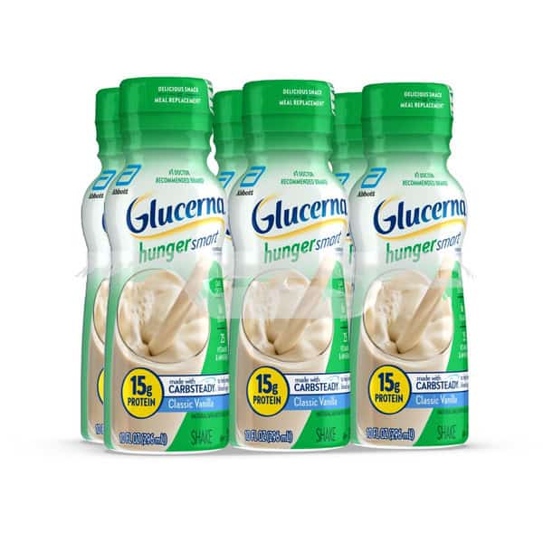 Glucerna Hunger Smart shakes are designed to replace poor meals or snacks for people with diabetes. They are made with CARBSTEADY, a unique blend of low-glycemic carbohydrates to help minimize blood sugar spikes,* as well as 15g of protein to help manage hunger. Each shake contains nutrients for immune system support, like vitamins A & D, zinc, and antioxidants (vitamins C & E and selenium). They are available in Classic Chocolate, Classic Vanilla, Classic Strawberry, and Peaches & Crème flavors. Glucerna is the #1 nutrition brand recommended by doctors for people with diabetes. Gluten-free and suitable for lactose intolerance.†