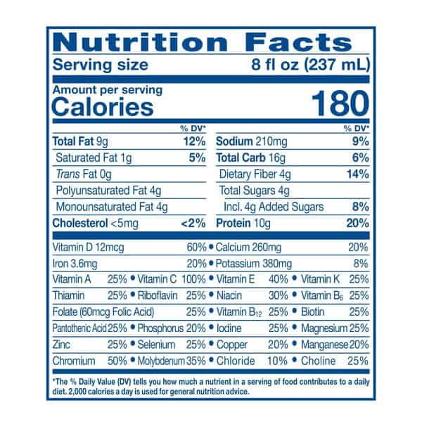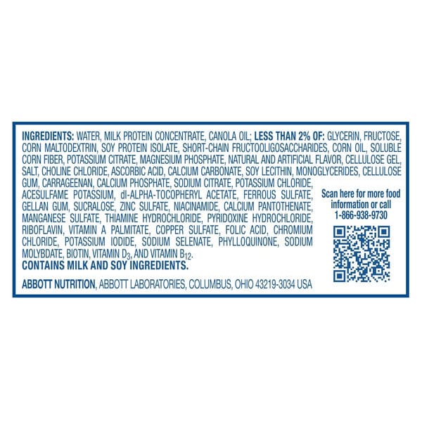 Water, Milk Protein Concentrate, Canola Oil, Corn Maltodextrin, Glycerin, Fructose, Soy Protein Isolate; Less Than 1% Of: Short-chain Fructooligosaccharides, Corn Oil, Potassium Citrate, Magnesium Phosphate, Cellulose Gel, Natural And Artificial Flavors, Salt, Choline Chloride, Calcium Carbonate, Ascorbic Acid, Monoglycerides, Soy Lecithin, Cellulose Gum, Carrageenan, Sodium Citrate, Calcium Phosphate, Potassium Hydroxide, Potassium Chloride, Sucralose, Acesulfame Potassium, Ferrous Sulfate, Dl-alpha-tocopheryl Acetate, Gellan Gum, Zinc Sulfate, Niacinamide, Manganese Sulfate, Calcium Pantothenate, Copper Sulfate, Vitamin A Palmitate, Thiamine Hydrochloride, Pyridoxine Hydrochloride, Riboflavin, Chromium Chloride, Folic Acid, Biotin, Sodium Molybdate, Potassium Iodide, Sodium Selenate, Phylloquinone, Vitamin D3 And Vitamin B12.