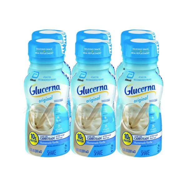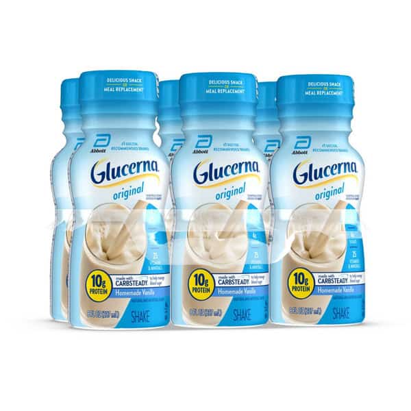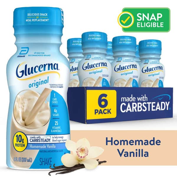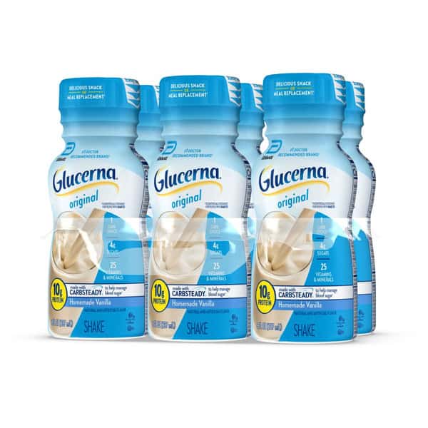 Glucerna Original shakes are scientifically designed to help people with diabetes and prediabetes manage blood sugar response.* They are made with CARBSTEADY, a unique blend of low-glycemic carbohydrates to help manage blood sugar response,* as well as 10g of protein to support muscle and help manage hunger. Glucerna Original shakes have 25 vitamins and minerals, 4g sugars, 1 carb choice, and nutrients to support immune system health.†A delicious small meal or snack, they’re suitable for lactose intolerance,‡ and gluten-free. Glucerna is the #1 doctor-recommended nutrition brand for people with diabetes. * Designed to help minimize the blood sugar spike from consuming Glucerna compared to high-glycemic carbohydrates. †Nutrients include protein, vitamins A & D, zinc, and antioxidants (vitamin C & E and selenium). ‡ Not for people with galactosemia.