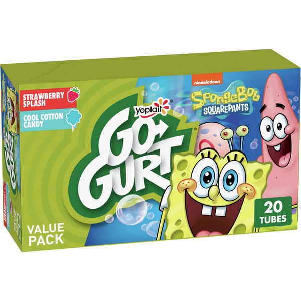 • CONTAINS: One 40 oz Variety Pack of Yoplait Go-GURT SpongeBob SquarePants Strawberry Splash Flavored and Cool Cotton Candy Flavored Fat Free Yogurt; Twenty 2 oz yogurt tubes total