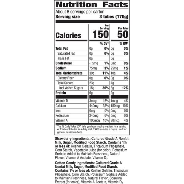 Strawberry Ingredients: Cultured Grade A Nonfat Milk, Sugar, Modified Food Starch, Contains 1% Or Less Of: Kosher Gelatin, Tricalcium Phosphate, Vegetable Juice (for Color), Potassium Sorbate Added To Maintain Freshness, Natural Flavor, Vitamin A Acetate, Vitamin D₃, Cotton Candy Ingredients: Cultured Grade A Nonfat Milk, Sugar, Modified Food Starch, Contains 1% Or Less Of: Kosher Gelatin, Tricalcium Phosphate, Potassium Sorbate Added To Maintain Freshness, Natural Flavor, Spirulina Extract (for Color), Vitamin A Acetate, Vitamin D₃