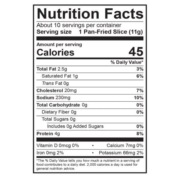 Cooking Instructions: Skillet: Cook in skillet over low heat. Turn frequently, allowing slices to brown evenly. Bake: Place separated slices on rack in a shallow pan. Bake about 15 minutes at 400 degrees F. no turning necessary. Microwave: Place slices in shallow glass container or paper plate. Cover with paper towel. Cook on high power. 2 slices: 1 1/2 minutes, 4 slices: 2 1/2 minutes. Air Fry: Pre-heat air fryer to 350 degrees F, lay slices a mesh/wire rack and cook slices for 7 minutes.