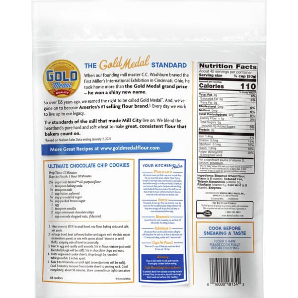 Gold Medal All Purpose Flour is the perfect companion in the kitchen. This versatile flour is strong enough for high-rising bread and mellow enough for your favorite pie crust. It can be used anytime a recipe calls for flour. A blend of pure white hard and soft wheat means every baked bite looks and tastes its absolute best. It can be used in recipes from breads to pizza dough and cookies to cakes. Comes in a convenient, resealable bag and is presifted to help you get to the mixing bowl sooner. Whether you’re whipping up a birthday cake, or want to fill the house with the scent of freshly baked bread, choose our flour as your go-to ingredient for flawless taste and texture. Gold Medal has over 135 years of baking success. We mill the flour that people rely on to make everything from family favorites to new and inspired creations. We put our best into everything we do – so you can too.
