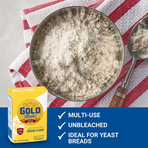 • CONTAINS: Gold Medal Premium Quality Unbleached Bread Flour, 5 lb bag; in White Bread Flours