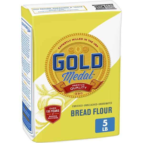 Give your loaves and crusts great lift and texture with Gold Medal Premium Quality Bread Flour. With its extra elasticity, use this flour for making delicious buns, rolls, and more. Create the perfect pizza crust or baguette with this flour. Add extra chewiness to your cookies and breads by using this flour instead of all purpose flour, cup for cup. Add your own creative flair to your bakes with the versatile bread flour that turns an everyday recipe into a family tradition. With your imagination and your own special touch, there are no limits to what you can do with this remarkable flour. Gold Medal has over 135 years of baking success. We mill the flour that people rely on to make everything from family favorites to new and inspired creations. We put our best into everything we do – so you can too. Contains Gold Medal Premium Quality Unbleached Bread Flour, 5 lb; in White Bread Flours.