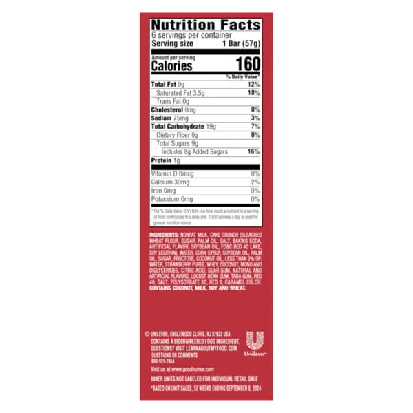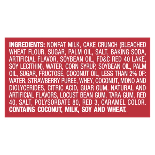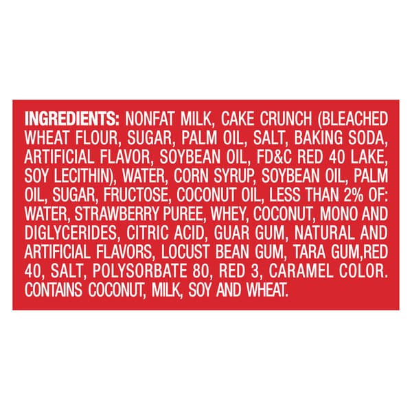 Nonfat Milk, Cake Crunch (bleached Wheat Flour, Sugar, Palm Oil, Salt, Baking Soda, Artificial Flavor, Soybean Oil, Fd&c Red 40 Lake, Soy Lecithin), Water, Corn Syrup, Soybean Oil, Palm Oil, Sugar, Fructose, Coconut Oil, Less Than 2% Of: Water, Strawberry Puree, Whey, Coconut, Mono And Diglycerides, Citric Acid, Guar Gum, Natural And Artificial Flavors, Locust Bean Gum, Tara Gum, Red 40, Salt, Polysorbate 80, Red 3, Caramel Color