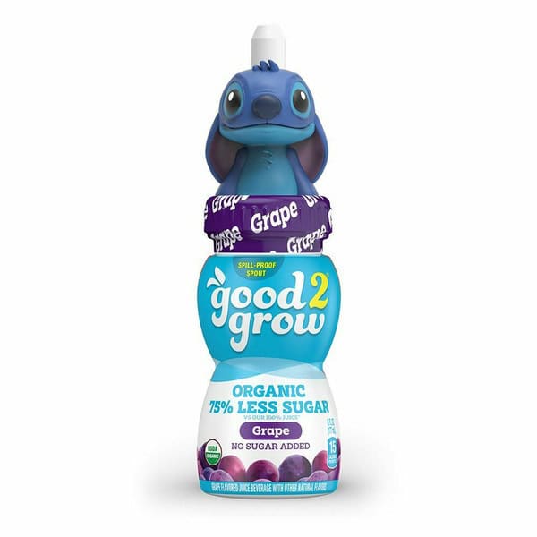 Grape flavored juice beverage with other natural flavors. No artificial flavors. 15 calories per bottle. This Product: 3 g sugar, 100% apple juice: 18 g sugar per 6 fl oz serving. USDA Organic. Certified Organic by International Certification Services, Inc. No sugar added. 75% less sugar vs. our 100% juice. Non GMO. Spill proof spout. No artificial colors. No artificial preservatives. Pasteurized. good2collect.com. Facebook. Instagram. 1-877-875-8443, 8am – 4pm EST, quality(at)good2grow.com. Grow your top collection! good2collect.com. Play games. Win prizes. BPA free. Bottled in USA.