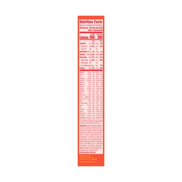 Goodles Noodles (Wheat Flour, Chickpea Protein, Wheat Protein, Nutrients Extracted From [Broccoli, Spinach, Kale, Pumpkin, Sweet Potato, Sunflower Seed, Cranberry, Chlorella, Maitake Mushroom, Shiitake Mushroom]), Cheddar Cheese Blend (Cultured Milk, Whey, Buttermilk, Salt, Disodium Phosphate, Lactic Acid, Enzymes), Nonfat Dry Milk, Butter (Cream, Salt, Enzymes), Salt, Tapioca Flour