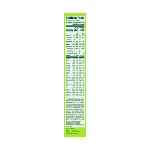 Goodles Noodles (Wheat Flour, Chickpea Protein, Wheat Protein, Nutrients Extracted From [Broccoli, Spinach, Kale, Pumpkin, Sweet Potato, Sunflower Seed, Cranberry, Chlorella, Maitake Mushroom Shiitake Mushroom]), Vegan White Cheddar (Dried Cashew Milk [Cashews, Chicory Root Fiber], Natural Flavor, Nutritional Yeast, Tapioca Maltodextrin, Salt, Tapioca Flour, Pea Protein, Lactic Acid, Dried Apple Cider Vinegar, Garlic)