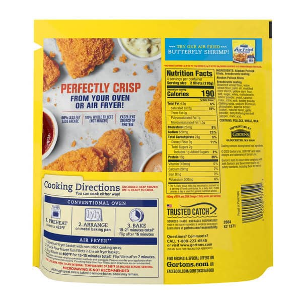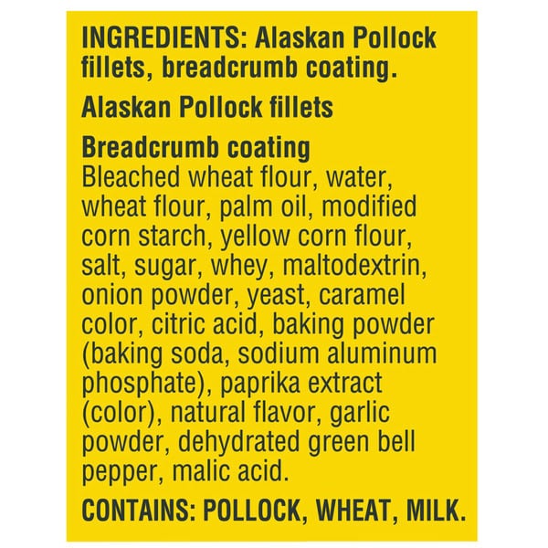 Alaska Pollock Fillets, Breadcrumb Coating. Alaska Pollock Fillets Breadcrumb Coating Bleached Wheat Flour, Water, Wheat Flour, Palm Oil, Modified Corn Starch, Yellow Corn Flour, Salt, Sugar, Whey, Maltodextrin, Dehydrated Onion, Yeast, Caramel Color, Citric Acid, Brewers Yeast, Baking Powder (baking Soda, Sodium Aluminum Phosphate), Paprika Extract (color), Natural Flavor, Dehydrated Garlic, Dehydrated Green Bell Pepper, Xanthan Gum, Malic Acid, Colored With Annatto And Turmeric Extract.