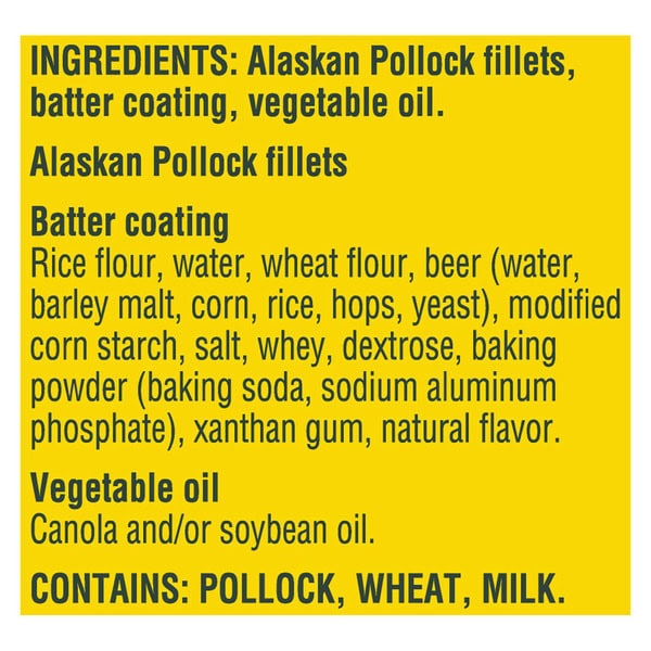 Alaskan Pollock Fillets, Batter Coating, Vegetable Oil. Alaskan Pollock Fillets Batter Coating Rice Flour, Water, Wheat Flour, Beer (water, Barley Malt, Corn, Rice, Hops, Yeast), Tapioca Dextrin, Modified Corn Starch, Salt, Whey, Dextrose, Baking Powder (baking Soda, Sodium Aluminum Phosphate, Cream Of Tartar), Sunflower Lecithin, Xanthan Gum, Natural Flavor. Vegetable Oil Canola And/or Soybean Oil.