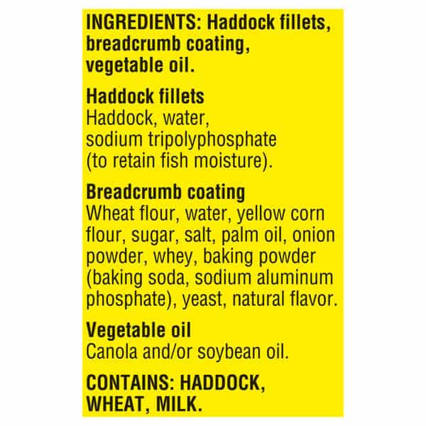 Haddock Fillets, Breadcrumb Coating, Vegetable Oil. Haddock Fillets Haddock, Water, Sodium Tripolyphosphate (to Retain Fish Moisture). Breadcrumb Coating Wheat Flour, Water, Yellow Corn Flour, Sugar, Salt, Palm Oil, Onion Powder, Whey, Baking Powder (baking Soda, Sodium Aluminum Phosphate), Yeast, Natural Flavor. Vegetable Oil Canola And/or Soybean Oil.