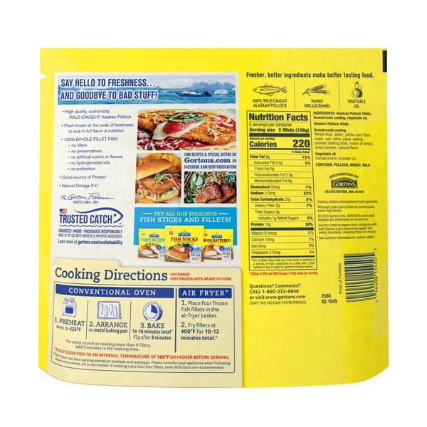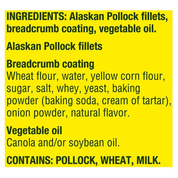 Alaskan Pollock Fillets, Breadcrumb Coating, Vegetable Oil. Alaskan Pollock Fillets Breadcrumb Coating Wheat Flour, Water, Yellow Corn Flour, Sugar, Salt, Whey, Yeast, Baking Powder (baking Soda, Cream Of Tartar), Onion Powder, Natural Flavor. Vegetable Oil Canola And/or Soybean Oil.