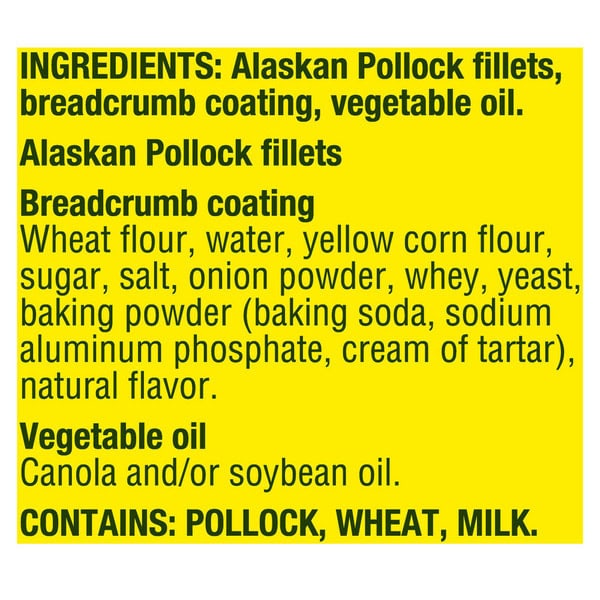 Minced Alaska Pollock, Breadcrumb Coating: Wheat Flour, Water, Sugar, Salt, Yeast Whey. Vegetable Oil: Cottonseed And/or Canola Oil, Rosemary Extract (to Protect Flavor).