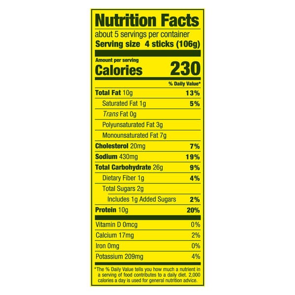 Cooking DirectionsConventional Oven1. Preheat oven to 450degF.2. Arrange on metal baking pan.3. Bake 15–17 minutes total*. Flip after 10 minutes.For extra crunch or cooking more than 8 fish sticks, add 3 minutes to the cooking time.*Fully cook fish to an internal temperature of 165degF or higher before serving. Cooking DirectionsMicrowave Oven (1100 Watts**)For more than 8 sticks, conventional oven directions are recommended.1. Arrange fish sticks in a single layer on a microwavable plate lined with parchment paper (do not use wax paper).2. Microwave on high according to the chart below.3. Caution: Food and plate will be hot! Let cool in microwave before serving.Microwave Cook Times*For 4 sticks, cook for 1 minute, flip, then cook for 30 seconds.For 8 sticks, cook for 2 minutes, flip, then cook for 1 minute.*Fully cook fish to an internal temperature of 165degF or higher before serving.**Note: For lower wattage microwaves, microwave an additional 1:30 minutes., Uncooked. Keep frozen until ready to cook.