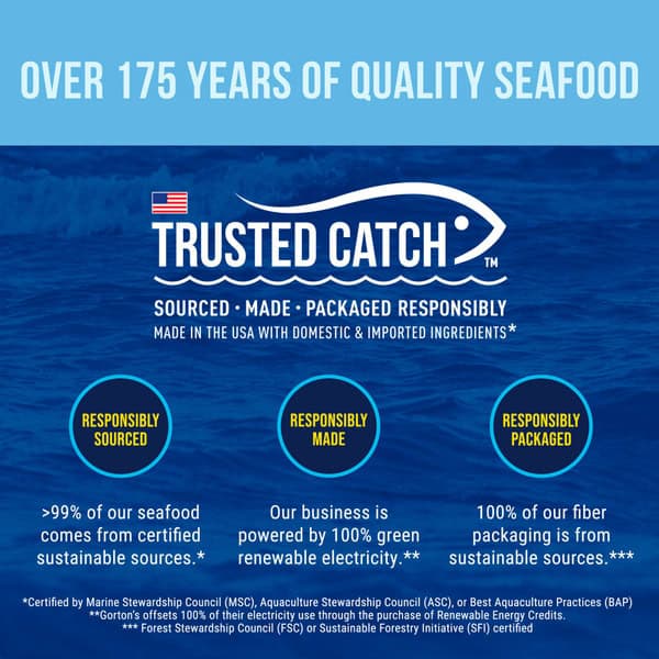Enjoy a great seafood dinner with an unbeatably fresh taste from the comfort of your home with Gorton’s. At Gorton’s, our passion for crafting only the finest foods with our freshest catches hasn’t changed since we first began casting our nets over 170 years ago. Easily and quickly prepare a delicious meal with our frozen fish, shrimp, crab, clams, and more. From our Crispy Battered Flounder Fillets and Breaded Popcorn Shrimp to our Premium Tilapia Fish Sticks, we offer a large selection of frozen seafood that the whole family will enjoy. Gorton’s is proud to provide only high-quality foods that are never prepared with fillers, artificial colors or flavors, or antibiotics. Additionally, our foods are still breaded and battered here in the USA*. As a seafood company that is leading the way in responsible practices, the preservation of our planet’s oceans is paramount to how we run our business. This is why we diligently work to minimize our environmental impact by ensuring our seafood is sourced, made, and packaged responsibly*. As a great fisherman used to say, “If something’s worth doing, it’s worth doing right.”