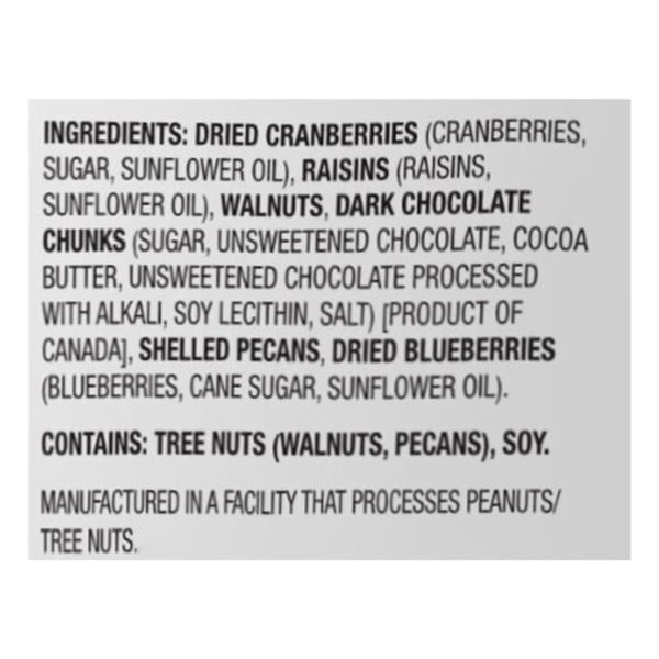 Dried Cranberries (Cranberries, Sugar, Sunflower Oil), Raisins (Raisins, Sunflower Oil), Walnuts, Dark Chocolate Chunks (Sugar, Unsweetened Chocolate Processed With Alkali, Soy Lecithin, Salt) [Product of Canada], Shelled Pecans, Dried Blueberries (Blueberries, Cane Sugar, Sunflower Oil)