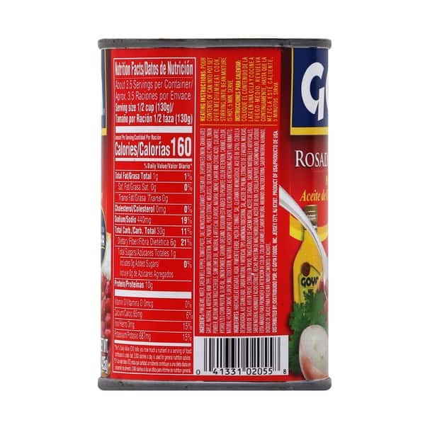 Pink Beans, Water, Green Bell Pepper, Tomato Paste, Salt, Monosodium Glutamate, Soybean Oil, Dehydrated Onion, Granulated Garlic, Natural & Artificial Ham Type Flavor (maltodextrin, Salt, Palm Oil, Yeast Extract, Molasses, Silicon Dioxide, Garlic Powder, Onion Powder, Medium Chain Triglycerides, Sunflower Oil, Natural & Artificial Flavors, Natural Smoke Flavor And Citric Acid), Culantro, Hydrolyzed Corn Protein, Olive Oil, Onion Powder, Ground Oregano, Disodium Edta Added To Promote Color Retention, Caramel Color, Natural Hickory Smoke Flavor (maltodextrin, Natural Hickory Smoke Flavor, Silicon Dioxide As Anticaking Agent) And Annatto.