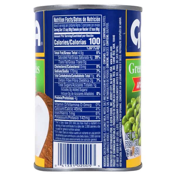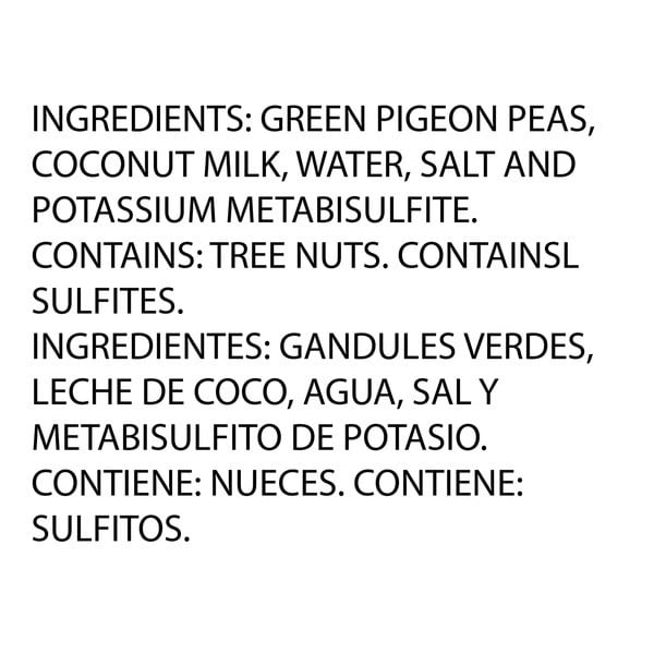 IngredientsGreen Pigeon Peas, Coconut Milk, Salt, Potassium Metabisulfite.