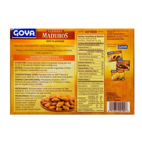 Cooking Instructions: Stove Top: Empty plantain slices into greased frying pan & fry for 3 minutes at medium heat turning once. Conventional Oven: Pre-heat oven to 350 degrees F. Remove plastic cover. Bake for 7 to 10 minutes or until slices look golden. Microwave: Remove plastic cover and microwave at high setting for 3 to 3-1/2 minutes or until slices are hot. Microwave ovens vary. Times given are approximate. Air Fryer: Place a single layer of maduros in the air fryer. Set temperature to 400 degrees F and set time for 8 minutes. Shake basket a couple of times during cooking. Remove and serve. For Food Safety & Best Quality: Heat from a frozen state. Heat thoroughly before eating. Use caution; product will be hot. We do not recommend cooking product in microwave oven.